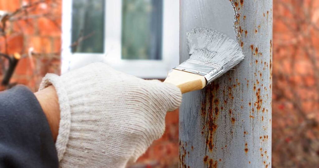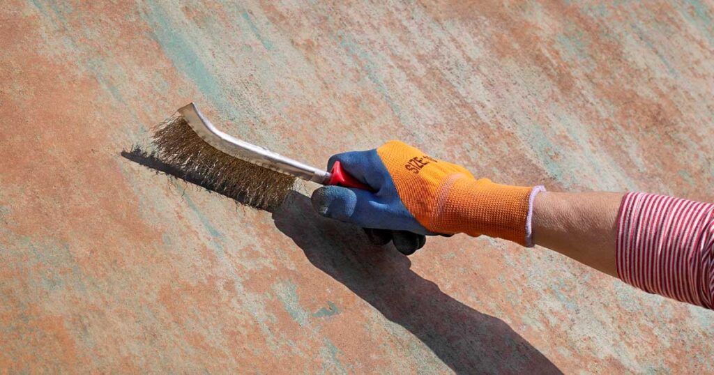 Základným krokom je odstránenie hrdze z kovu mechanickými nástrojmi. Dobrým pomocníkom je oceľová kefa, brúsny papier, rotačný brúsny nadstavec na vŕtačke alebo pieskovanie. Cieľom je zbaviť sa čo najväčšieho množstva korózie a vytvoriť mierne zdrsnený povrch pre lepšiu priľnavosť náteru.
